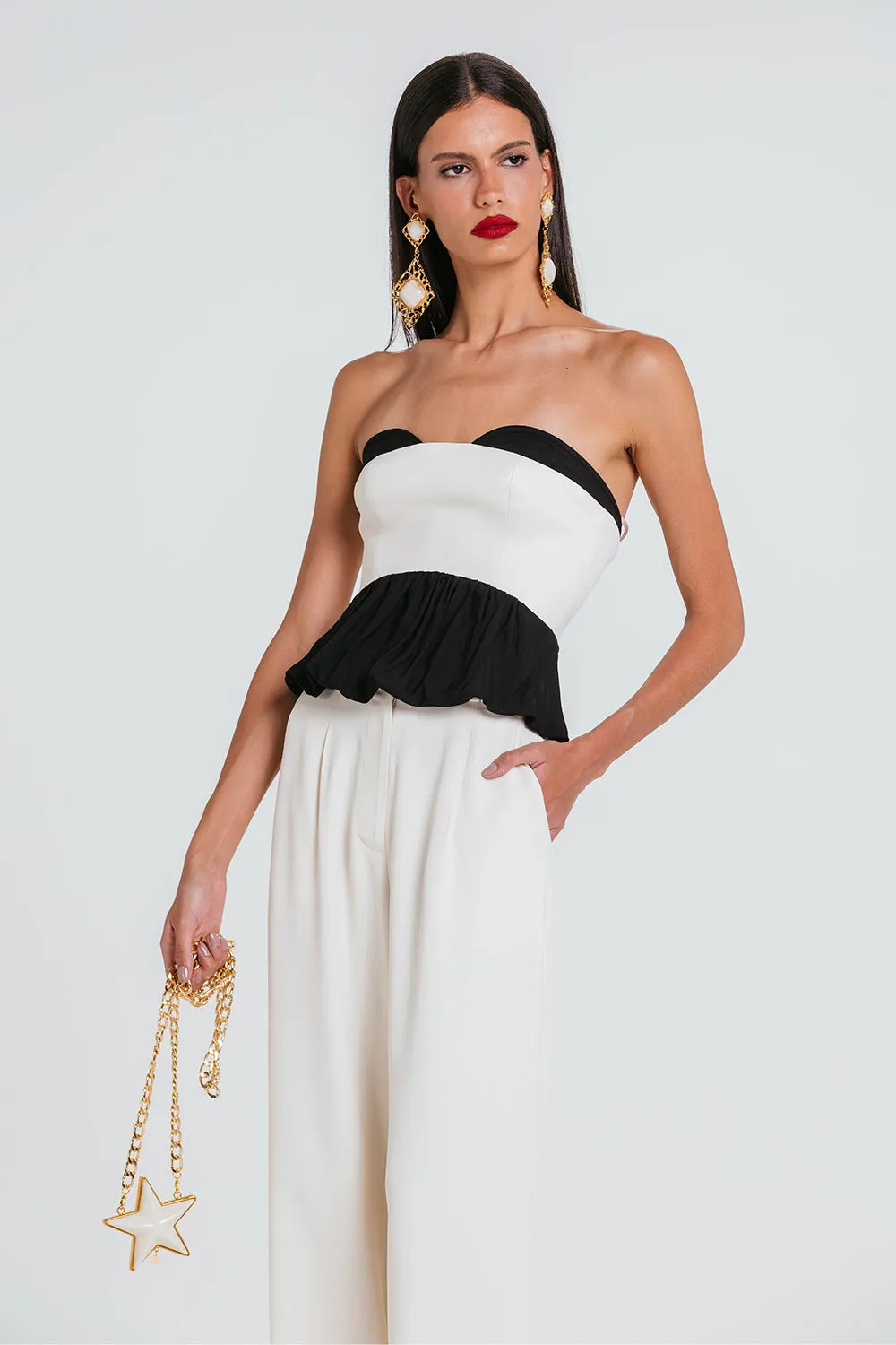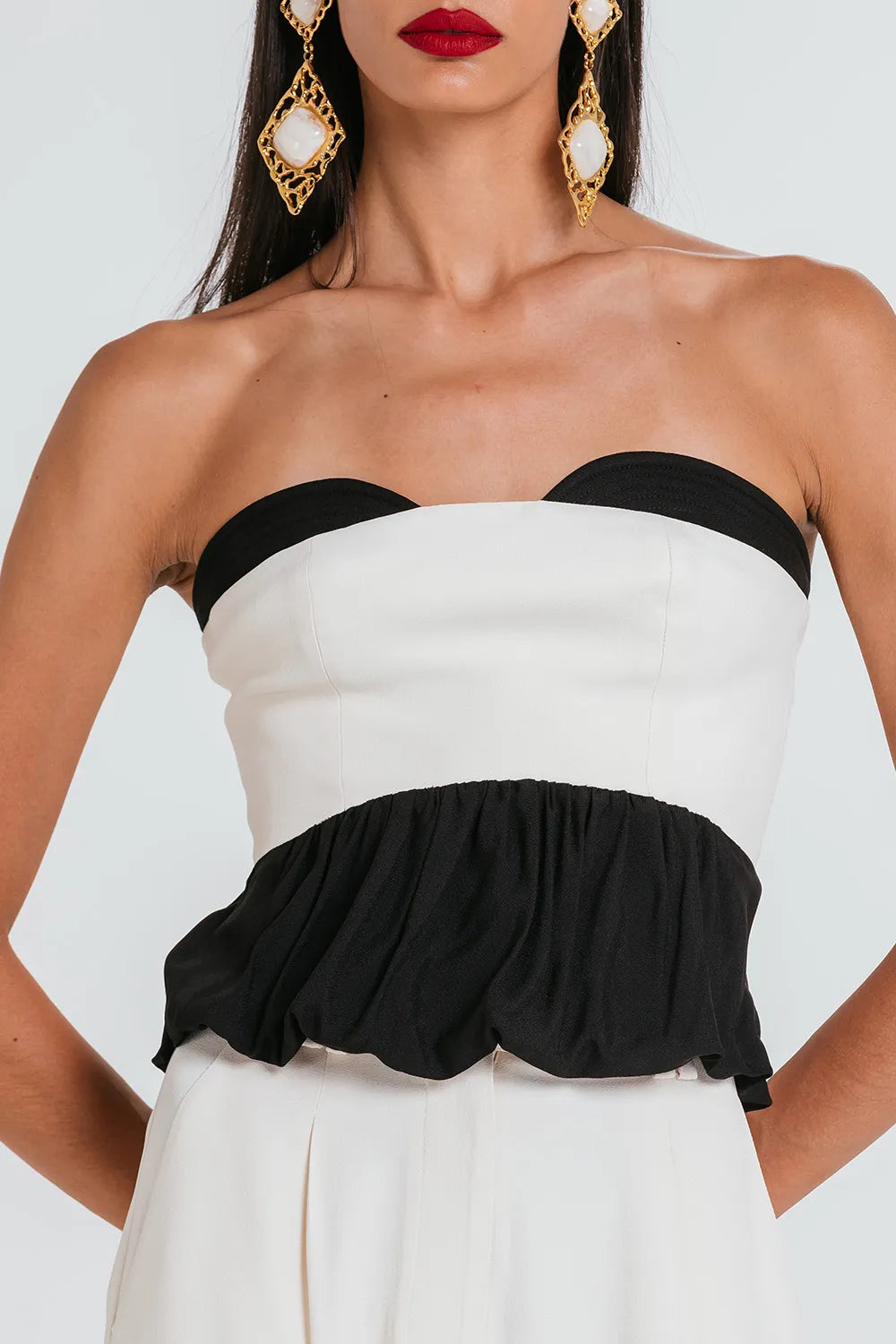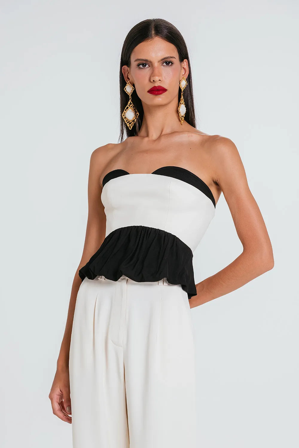 Confeccionado em nosso tecido mais nobre de alfaiataria, o crepe de acetato com viscose, o TOP MELISSA dispõe-se de detalhes arredondados no busto feito em cor contrastante. A peça apresenta peplum com volume levemente balonê, que proporciona movimento ao look.