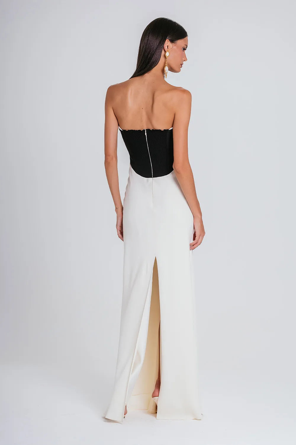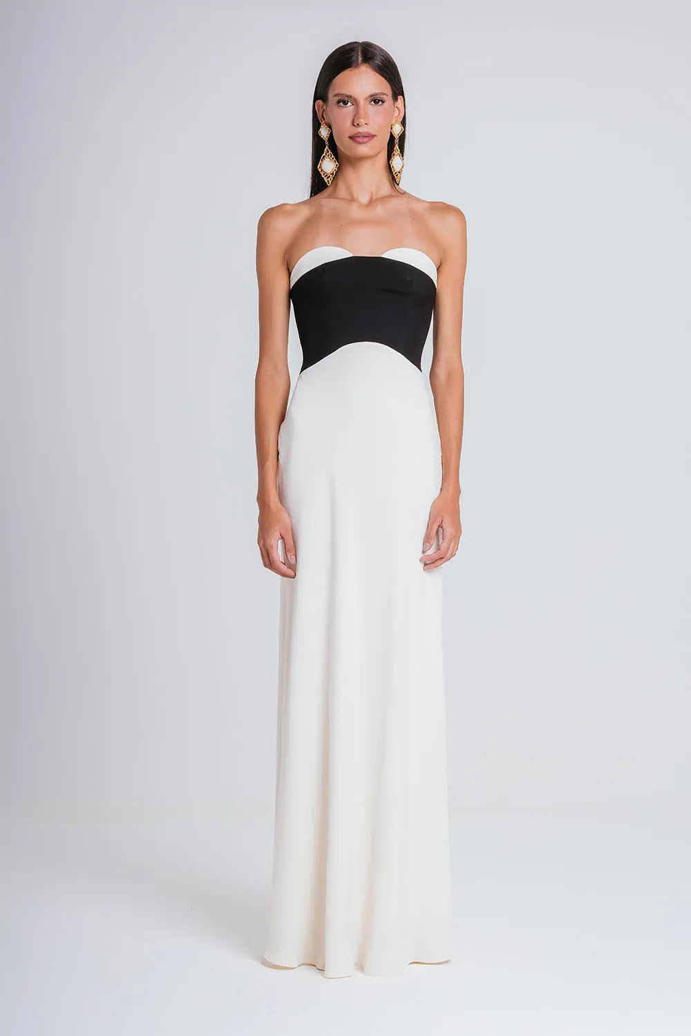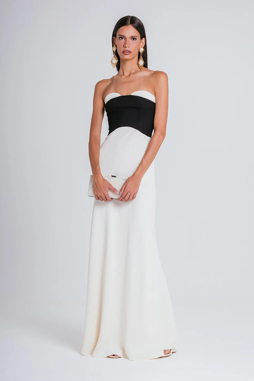O VESTIDO MELISSA apresenta modelagem sem alças com decote arredondado, evidenciando os ombros com charme. Possui comprimento longo, fenda traseira e corpo acinturado seguido por saia fluida e longa, reforçando a feminilidade e o refinamento da peça