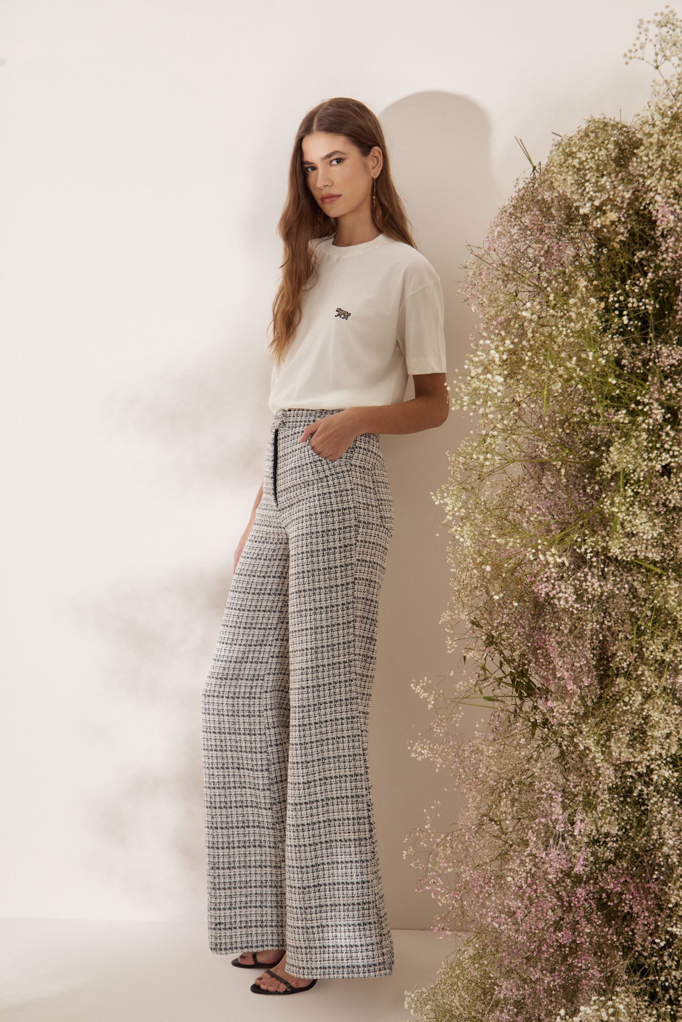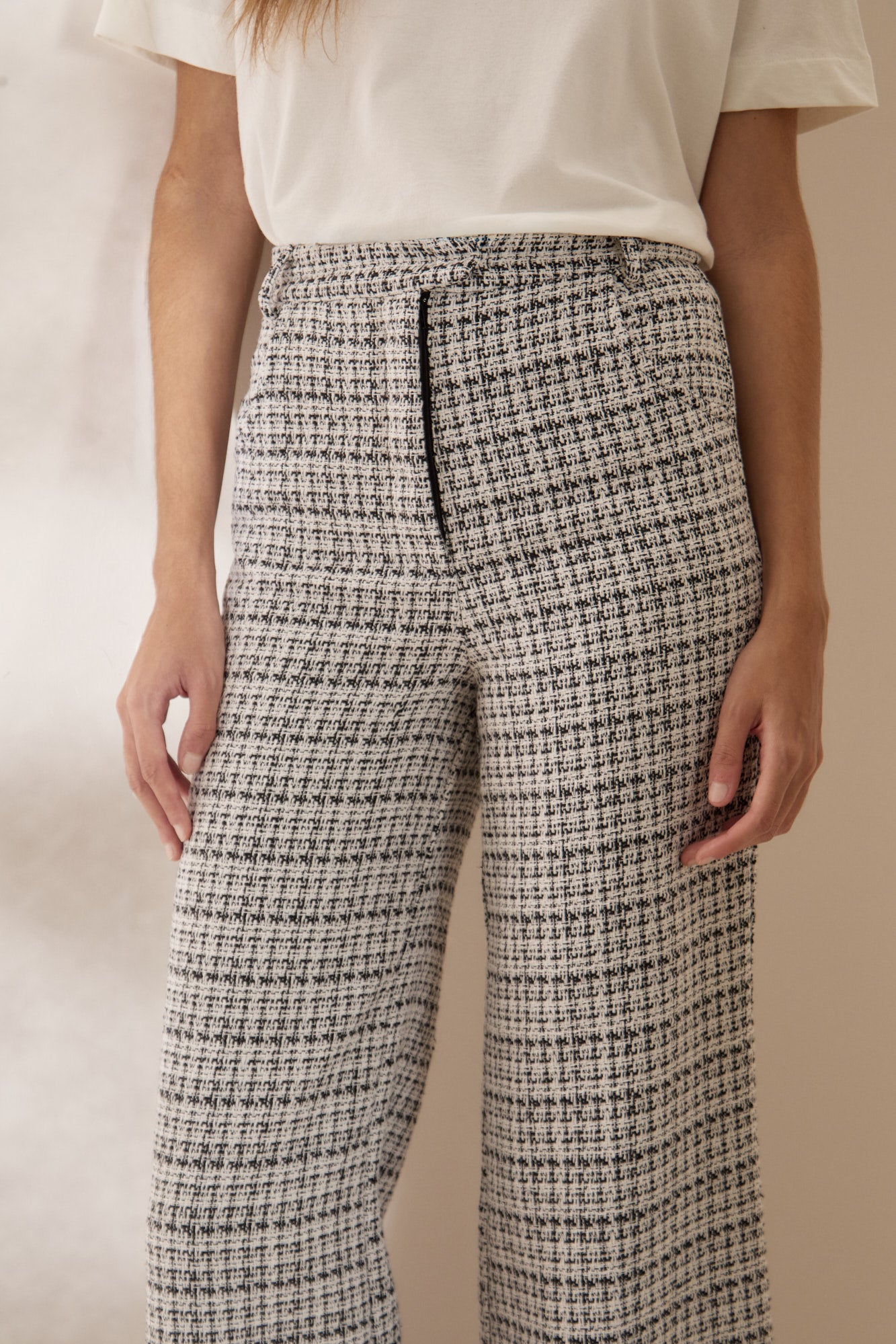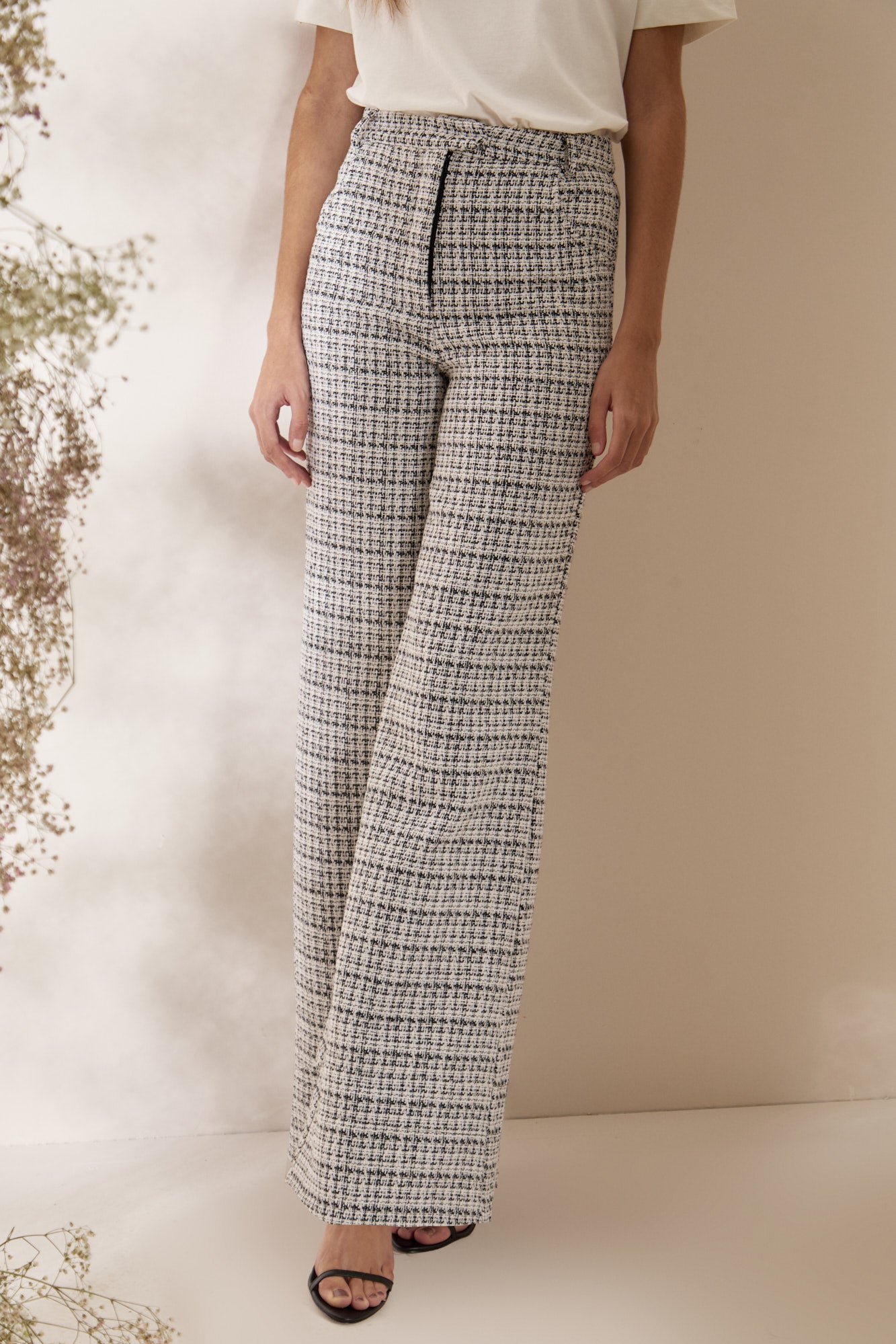 CALÇA TWEED P/B FLARE PRETO/OFF WHITE