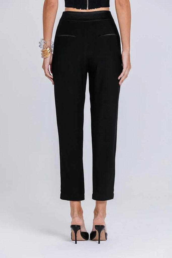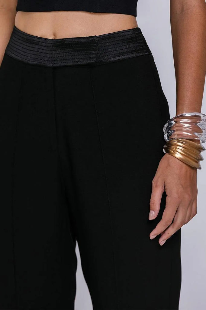 • Calça com recortes frontais, cós pespontado e transpassado.
