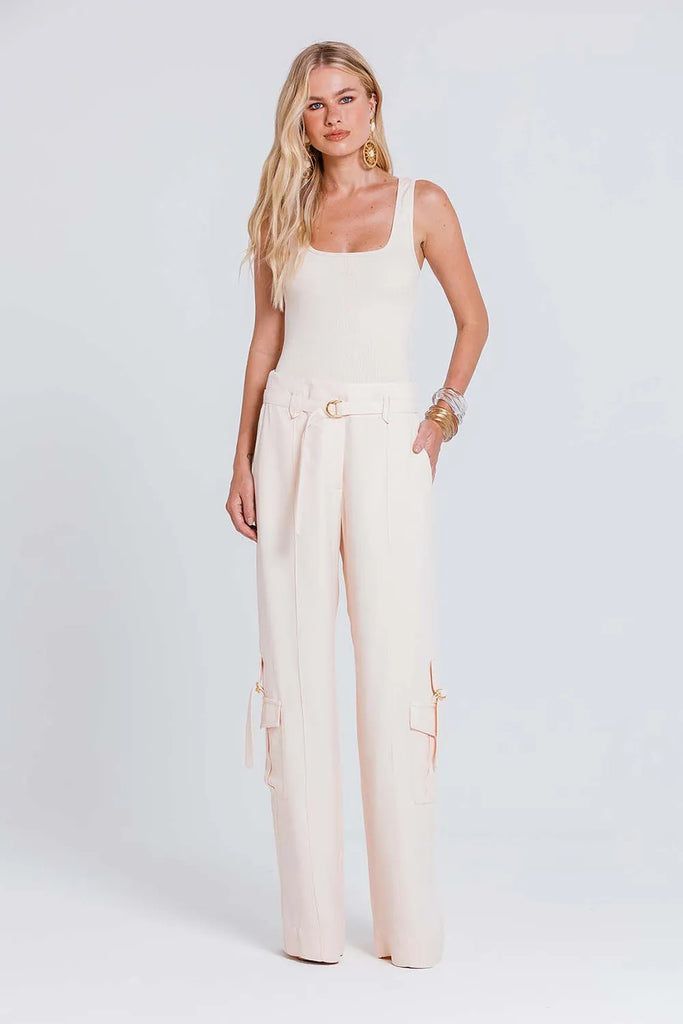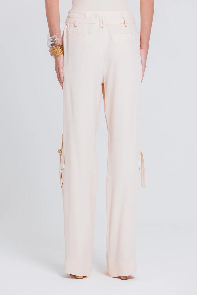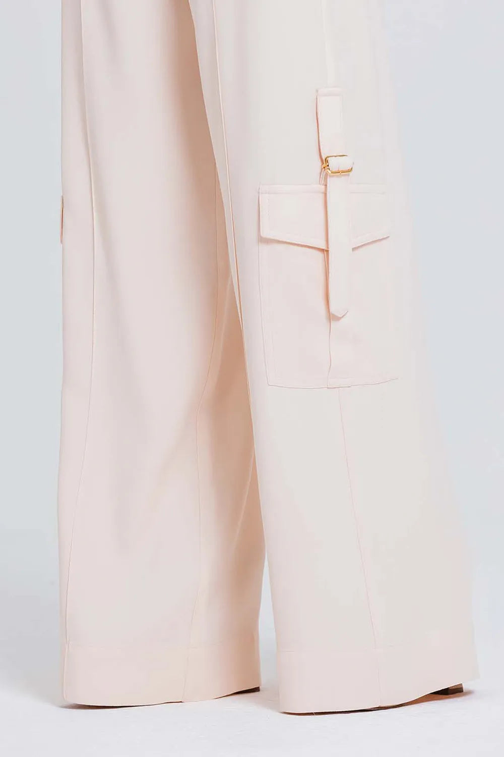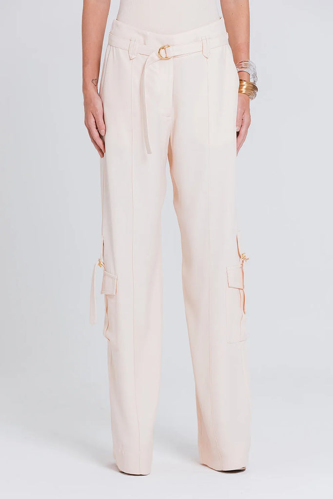 Confeccionado em crepe premium de acetato com viscose, proporciona toque macio e estrutura impecável. A peça apresenta modelagem cargo de cintura baixa, com bolsos laterais funcionais e bolsos sobrepostos com lapelas, arrematados por fivelas metálicas que imprimem um estilo urbano e sofisticado. Destaque para os frisos verticais frontais, que alongam a silhueta com elegância, além de passantes amplos e cinto incluso com fivela dupla em argolas metálicas douradas, elevando o visual com autenticidade.