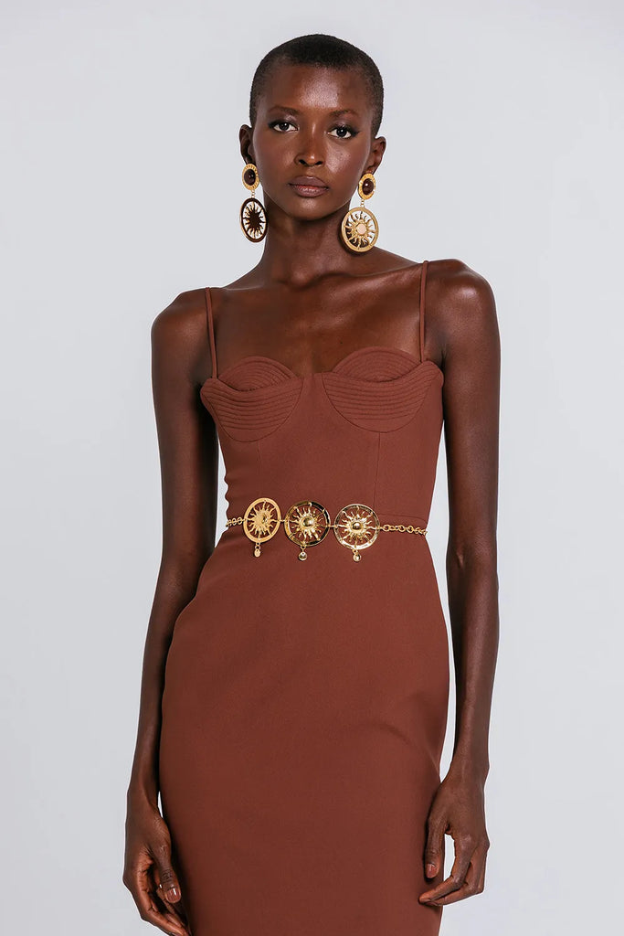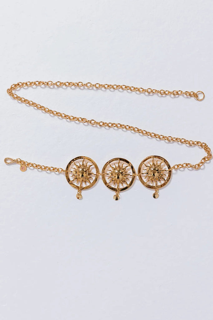 O Cinto Triplo é banhado a ouro e recebe acabamento antioxidante e antialérgico, garantindo conforto e durabilidade. Seu design é composto por três medalhas de sol conectadas por elos, criando um acessório sofisticado e luminoso. Uma peça que adiciona elegância instantânea a produções especiais.