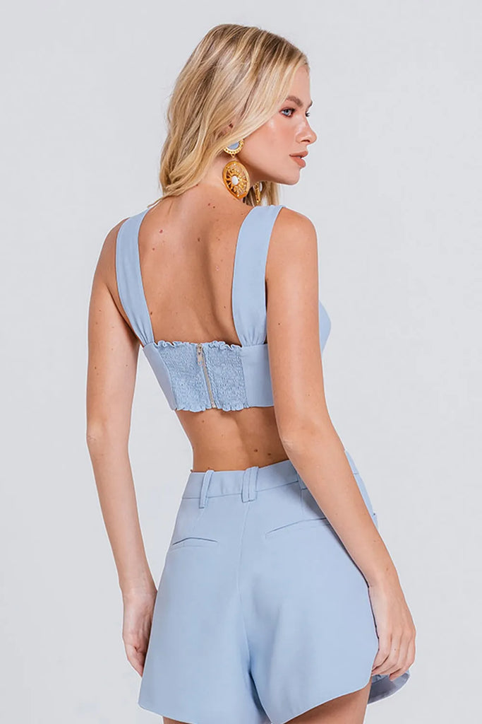 Combine o Top Lyra com a Calça Persefone para uma produção elegante e estruturada, ou com o Short Saia Florence para um visual casual e moderno.
