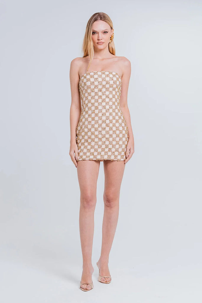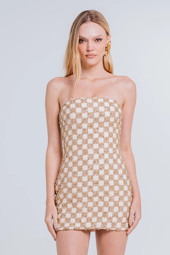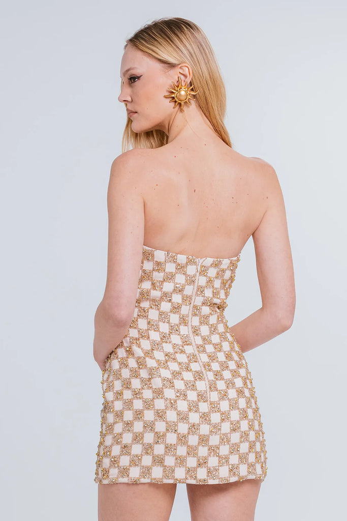 VESTIDO ÚRSULA é a escolha ideal para quem busca um visual marcante com elegância moderna. Confeccionado em nosso crepe premium com acetato e viscose, dispõe de toque suave e caimento estruturado, valorizando a silhueta. O Vestido Úrsula apresenta modelagem sem alças com decote reto, evidenciando os ombros com charme. Seu comprimento é curto, com caimento ajustado ao corpo, revelando uma estética moderna e refinada. O grande destaque fica por conta do bordado exclusivo, um mix de pedras e paetês plissados aplicados à mão, que criam um visual reluzente e impactante. Fechamento posterior por zíper invisível.