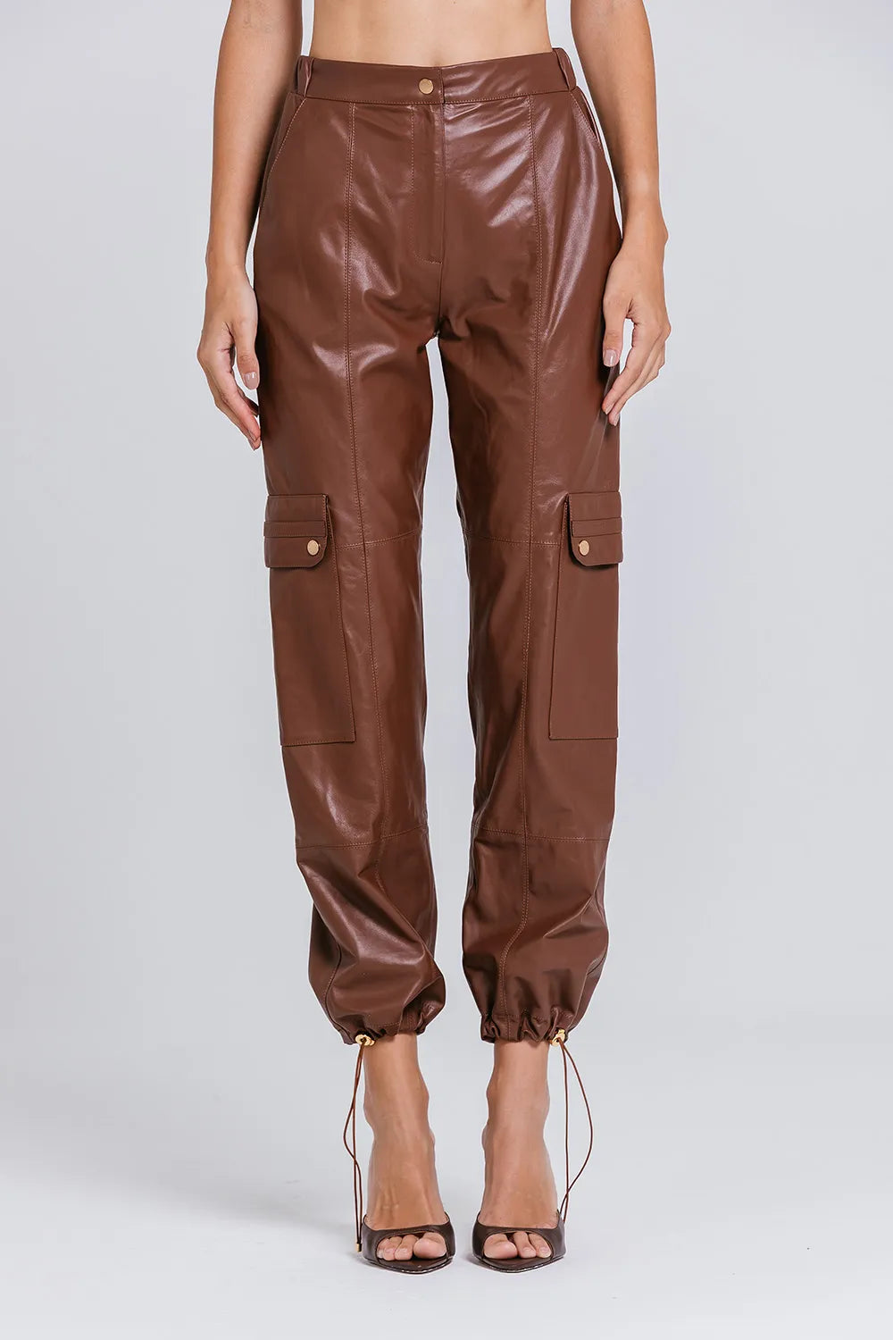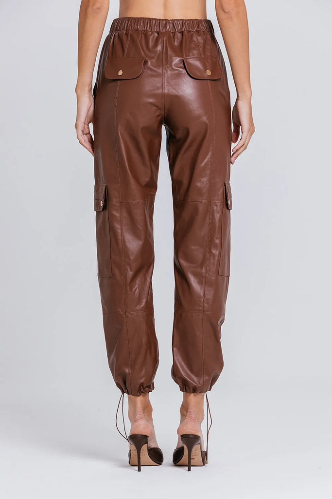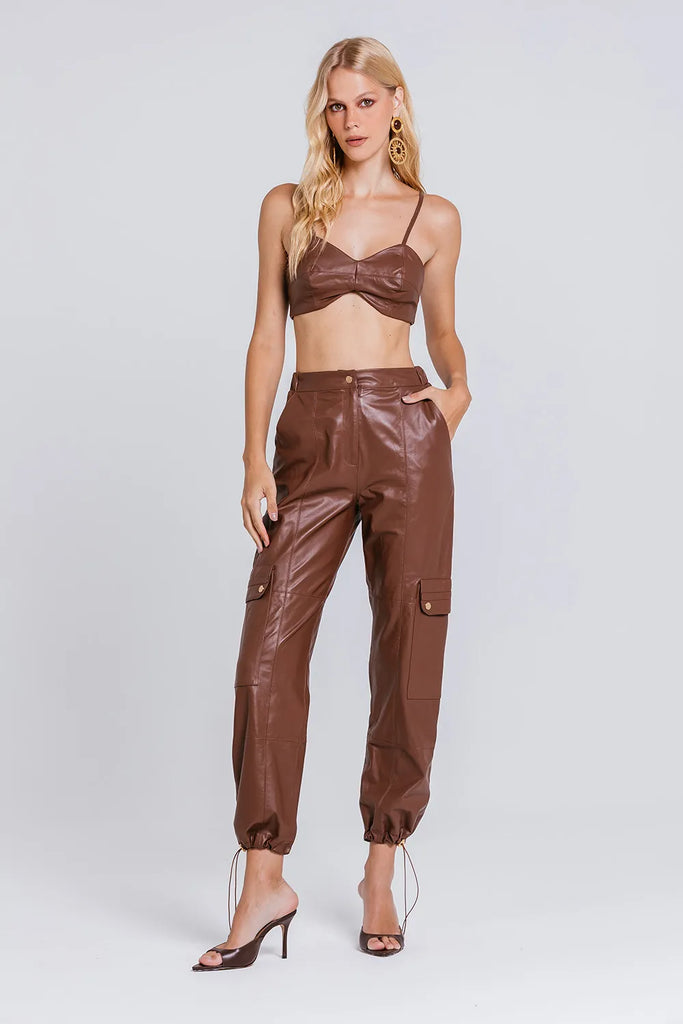Confeccionada em couro legítimo, que combina estrutura firme com toque surpreendentemente macio e brilho acetinado. A Calça Paloma apresenta recortes estratégicos, bolsos laterais modelo faca e bolsos sobrepostos com botões de pressão, reforçando a pegada utilitária. Possui também elástico na barra com reguladores metálicos, adicionando funcionalidade e estilo. Fechamento frontal feito por botão e zíper.