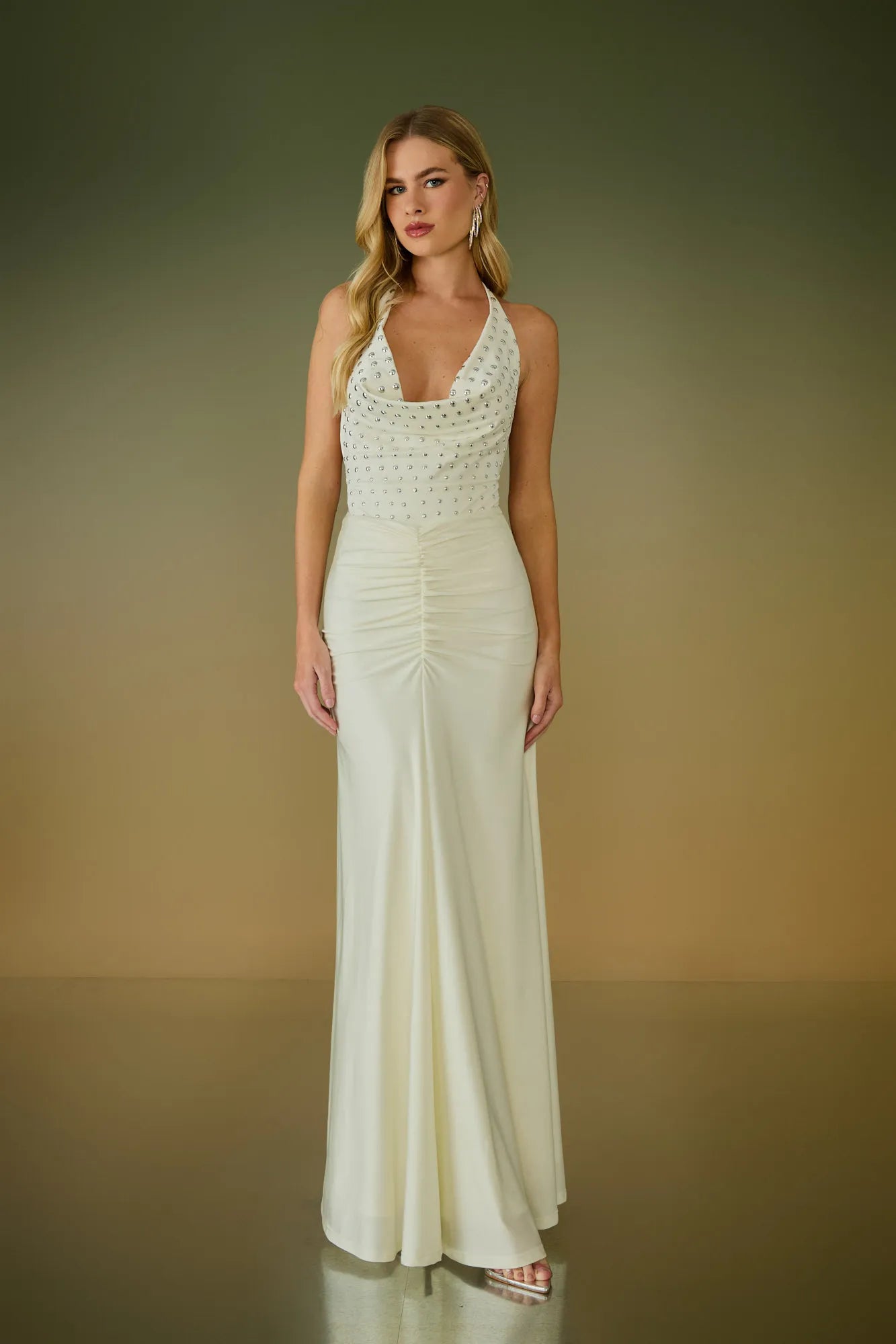 O decote degagê proporciona um caimento elegante e fluido no busto. As aplicações de brilho elevam a peça, transformando um body em uma opção sofisticada.