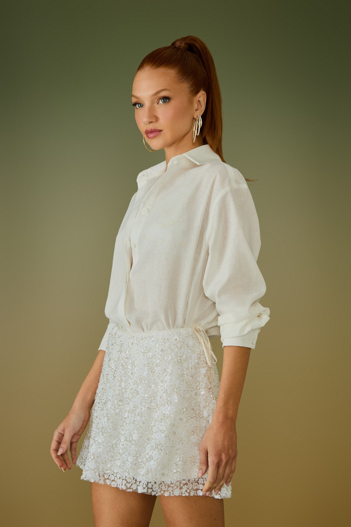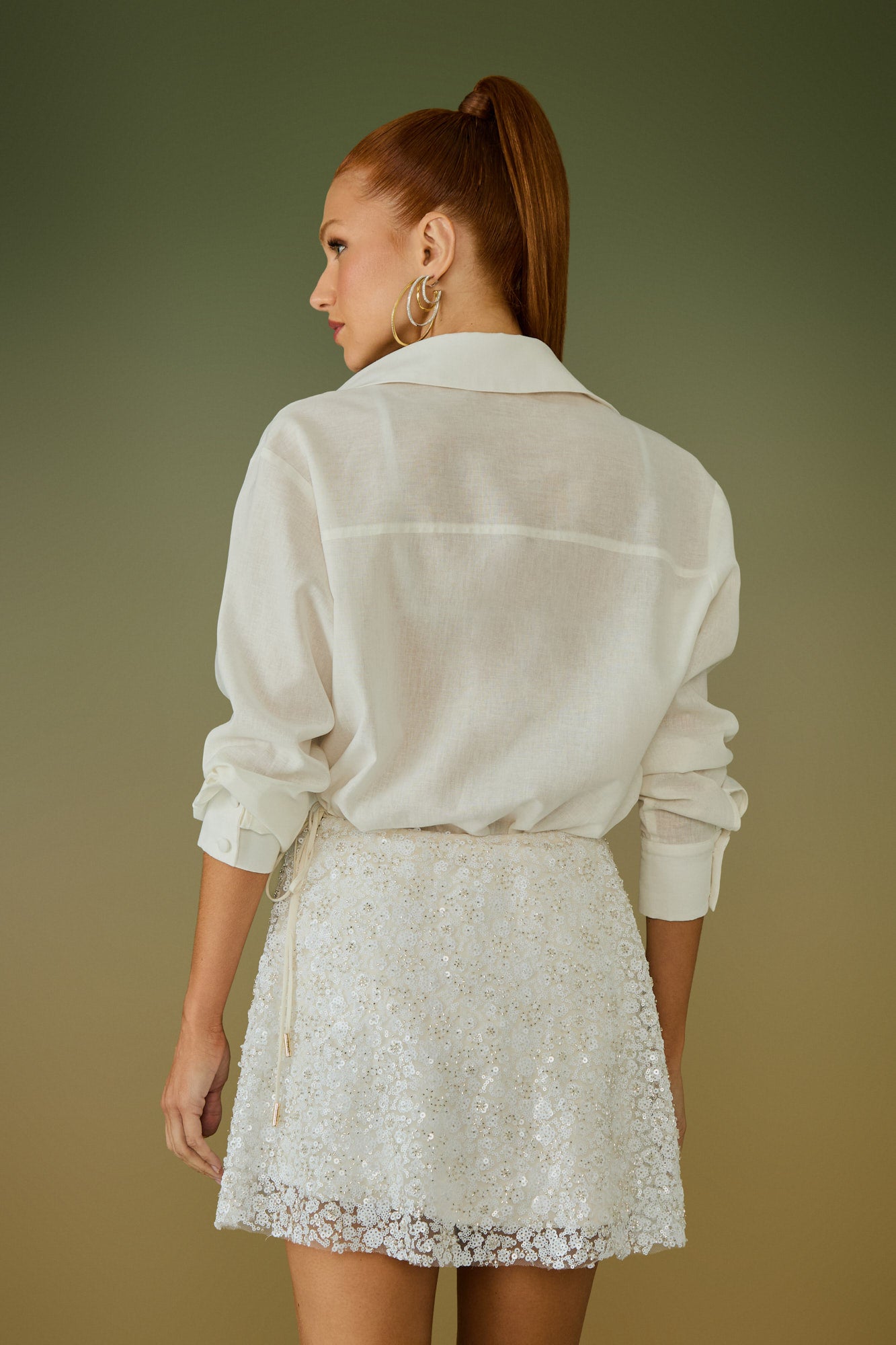 Esta cor clara e nobre atua como base perfeita para realçar o efeito 3D dos babados e amplificar o brilho discreto do bordado.