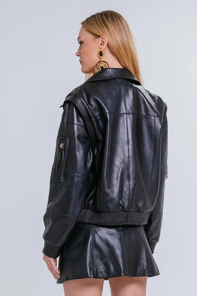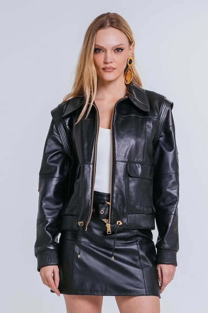 Confeccionada em couro legítimo, que combina estrutura firme com toque surpreendentemente macio e brilho acetinado. A Calça Paloma apresenta modelagem ampla com recortes estratégicos, bolsos frontais sobrepostos com abotoamento e detalhe utilitário de bolso com zíper na manga. A peça possui gola em estilo alfaiataria, barra e punhos em ribana e regulagem por elástico com reguladores de metal e acabamento pespontado. Fecho frontal por zíper metálico.