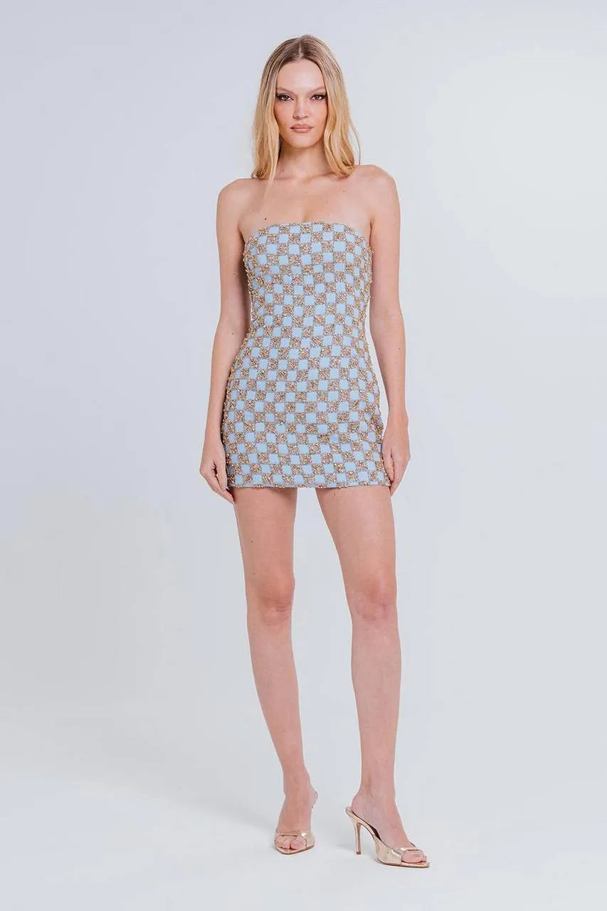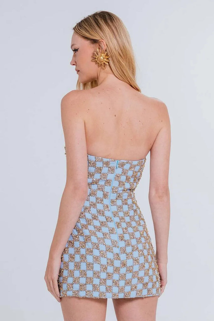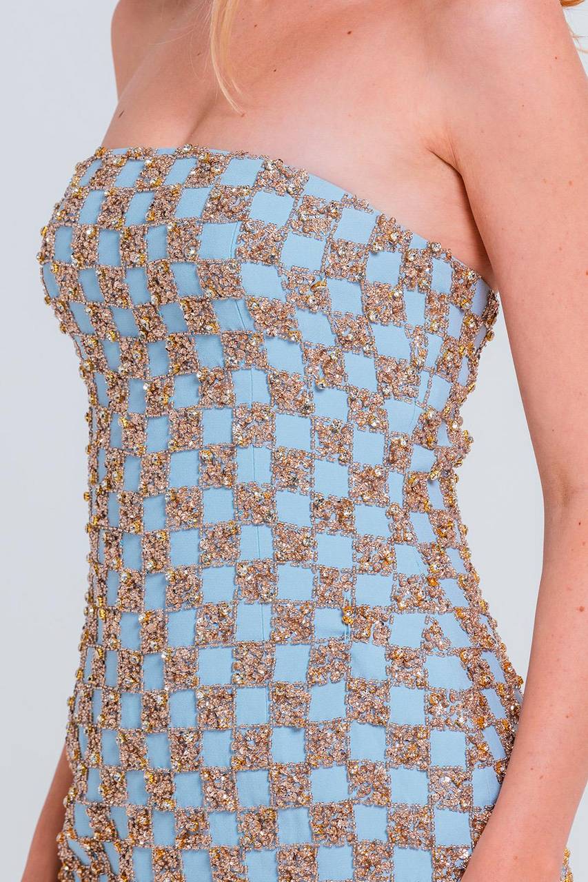 O VESTIDO ÚRSULA é a escolha ideal para quem busca um visual marcante com elegância moderna. Confeccionado em nosso crepe premium com acetato e viscose, dispõe de toque suave e caimento estruturado, valorizando a silhueta. O Vestido Úrsula apresenta modelagem sem alças com decote reto, evidenciando os ombros com charme. Seu comprimento é curto, com caimento ajustado ao corpo, revelando uma estética moderna e refinada. O grande destaque fica por conta do bordado exclusivo, um mix de pedras e paetês plissados aplicados à mão, que criam um visual reluzente e impactante. Fechamento posterior por zíper invisível.