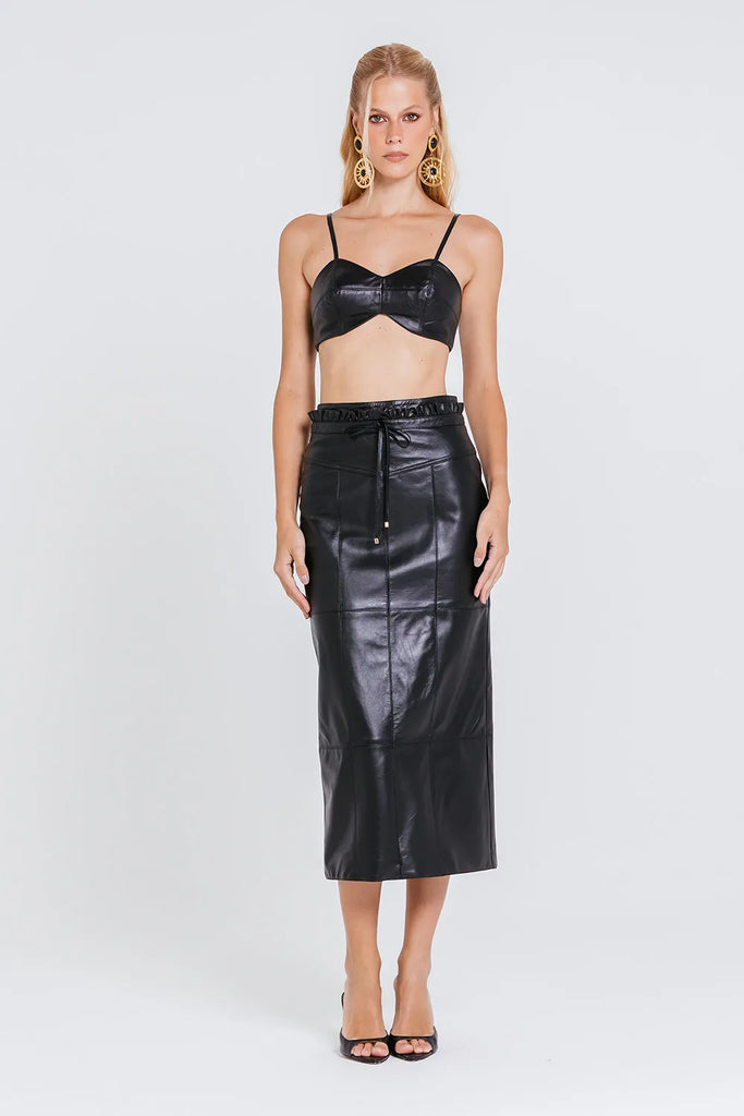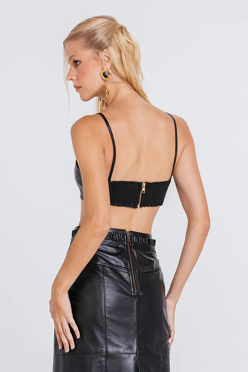 Confeccionado em couro legítimo, que combina estrutura firme com toque surpreendentemente macio e brilho acetinado. O Top Gisele apresenta modelagem em faixa com recortes estruturados e acabamento pespontado que valorizam a modelagem. As alças finas e o decote meia taça se unem à barra em formato V para um visual delicado e moderno.
