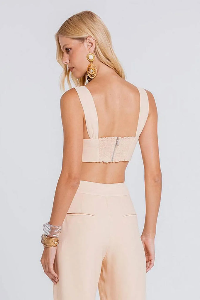 Confeccionado em crepe premium de acetato com viscose, oferece toque suave e caimento impecável. Sua modelagem cropped em estilo faixa valoriza a silhueta com um visual sofisticado, enquanto as alças estruturadas garantem conforto e segurança. O recorte triangular na barra proporciona um ar ousado e único à peça, trazendo personalidade para qualquer produção. O fechamento posterior em zíper metálico é seguido por lastex.