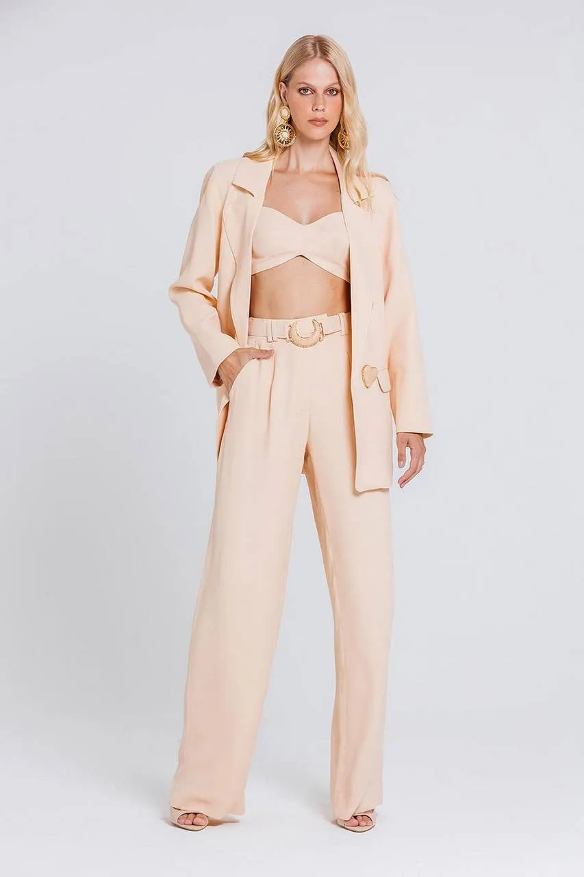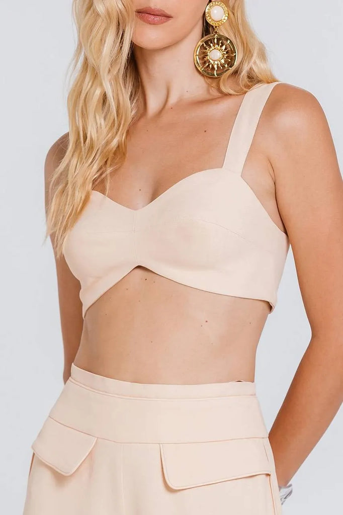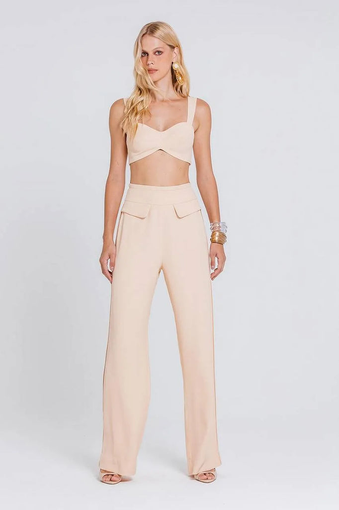 Combine o Top Lyra com a Calça Persefone para uma produção elegante e estruturada, ou com o Short Saia Florence para um visual casual e moderno.