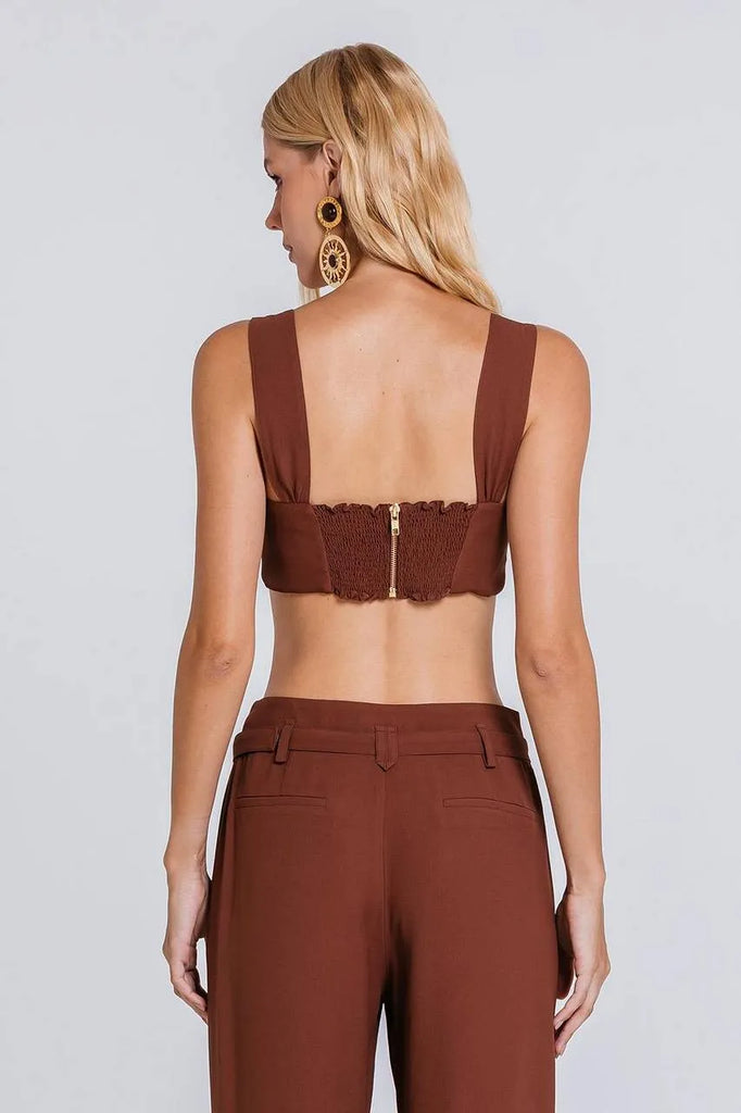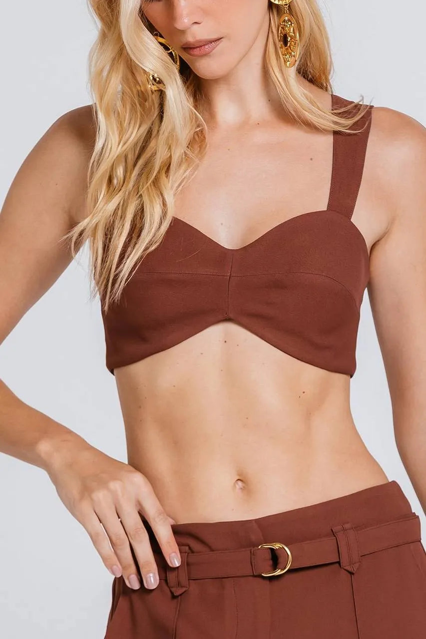 Confeccionado em crepe premium de acetato com viscose, oferece toque suave e caimento impecável. Sua modelagem cropped em estilo faixa valoriza a silhueta com um visual sofisticado, enquanto as alças estruturadas garantem conforto e segurança. O recorte triangular na barra proporciona um ar ousado e único à peça, trazendo personalidade para qualquer produção. O fechamento posterior em zíper metálico é seguido por lastex.