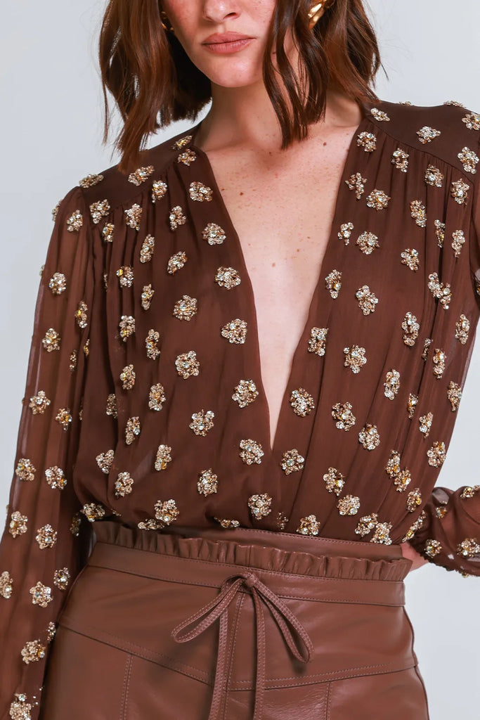 - Manga longa com decote em V profundo, franzidos nos ombros