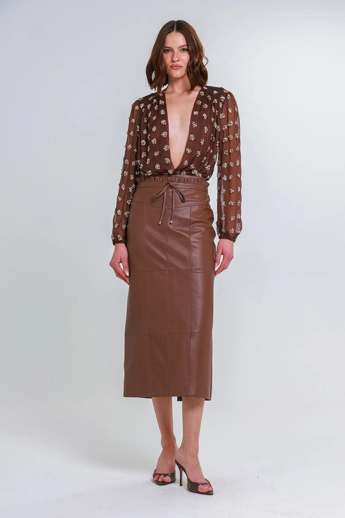 Confeccionado em tecido leve e fluido, apresenta decote profundo, mangas longas bufantes e transparência equilibrada com bordados que iluminam toda a parte frontal. Um design romântico e moderno que garante presença.