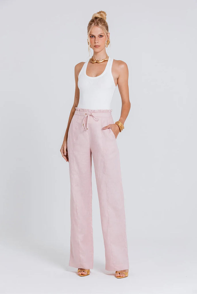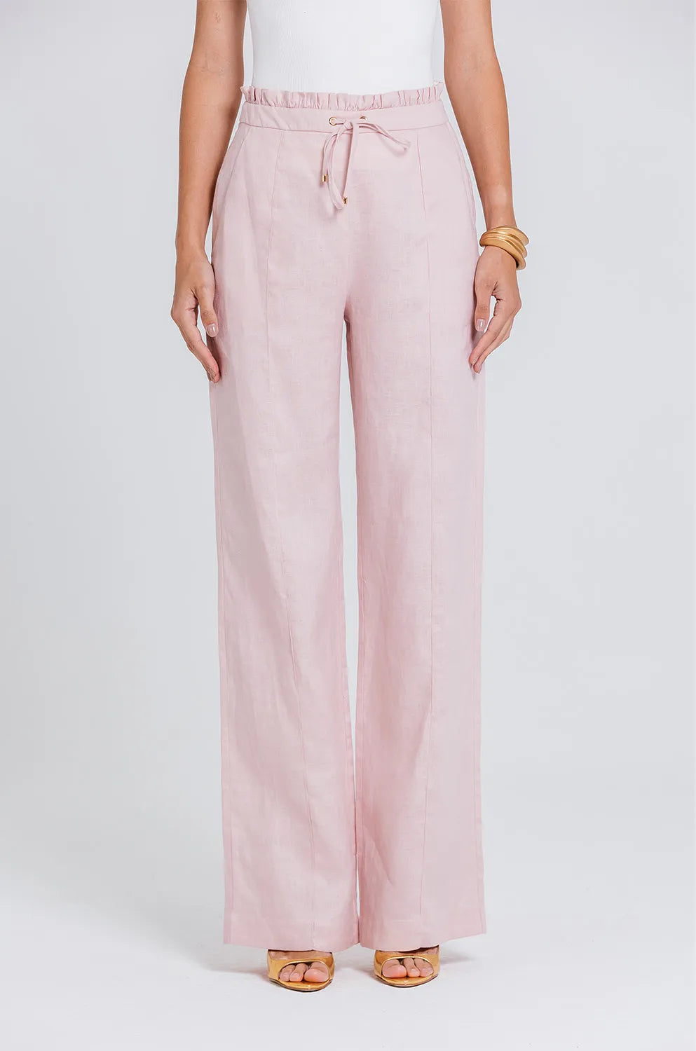 - Calça comprida com modelagem reta, bolsos laterais e cós franzido com detalhe em amarração na frente.