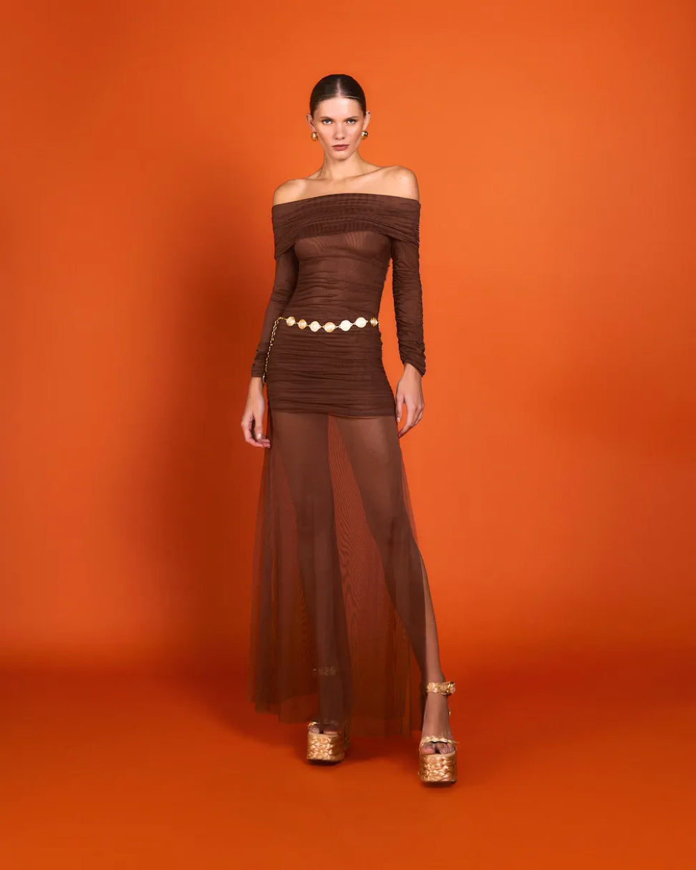 Saia longa em tule, desenvolvida com textura leve e transparência sutil que conferem movimento e sofisticação. A modelagem ajustada ao corpo destaca a silhueta, enquanto o comprimento fluido adiciona elegância e leveza à produção.