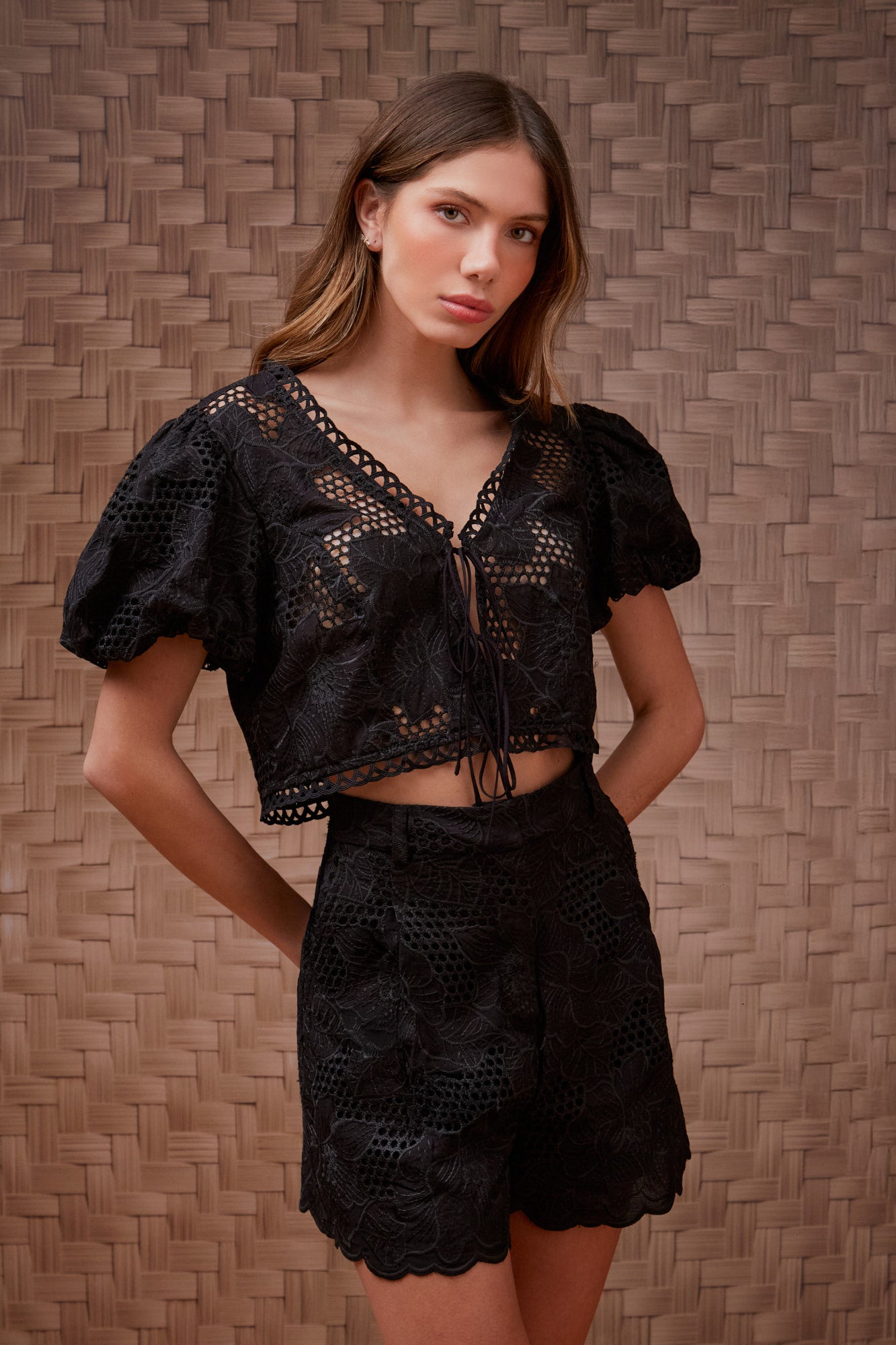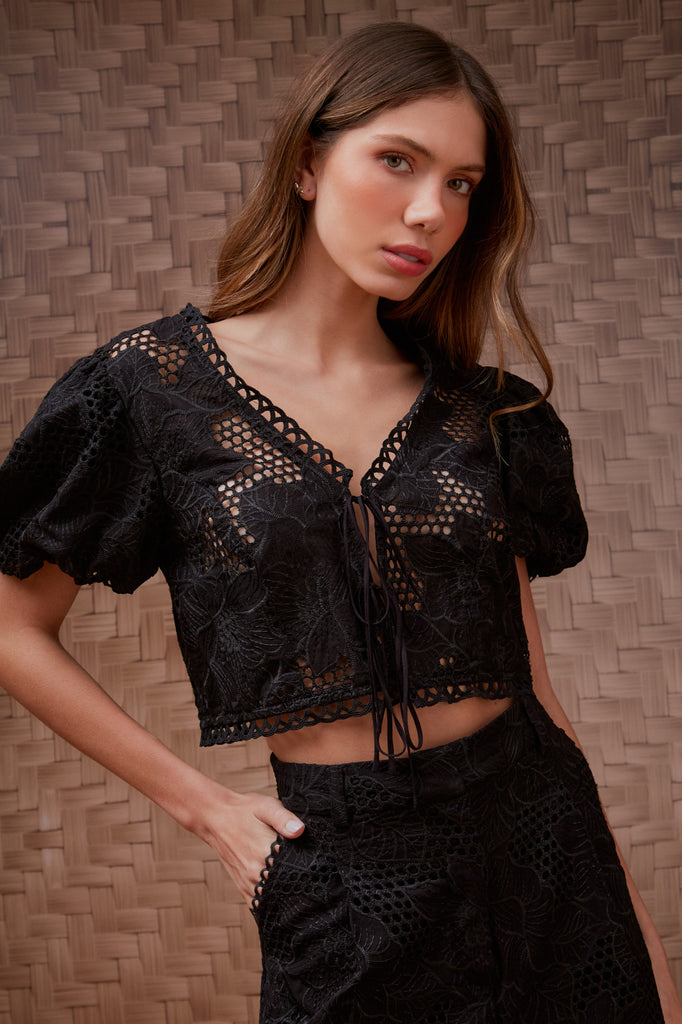 Conjunto Guipure Garden Manga Bufante Preto Litt