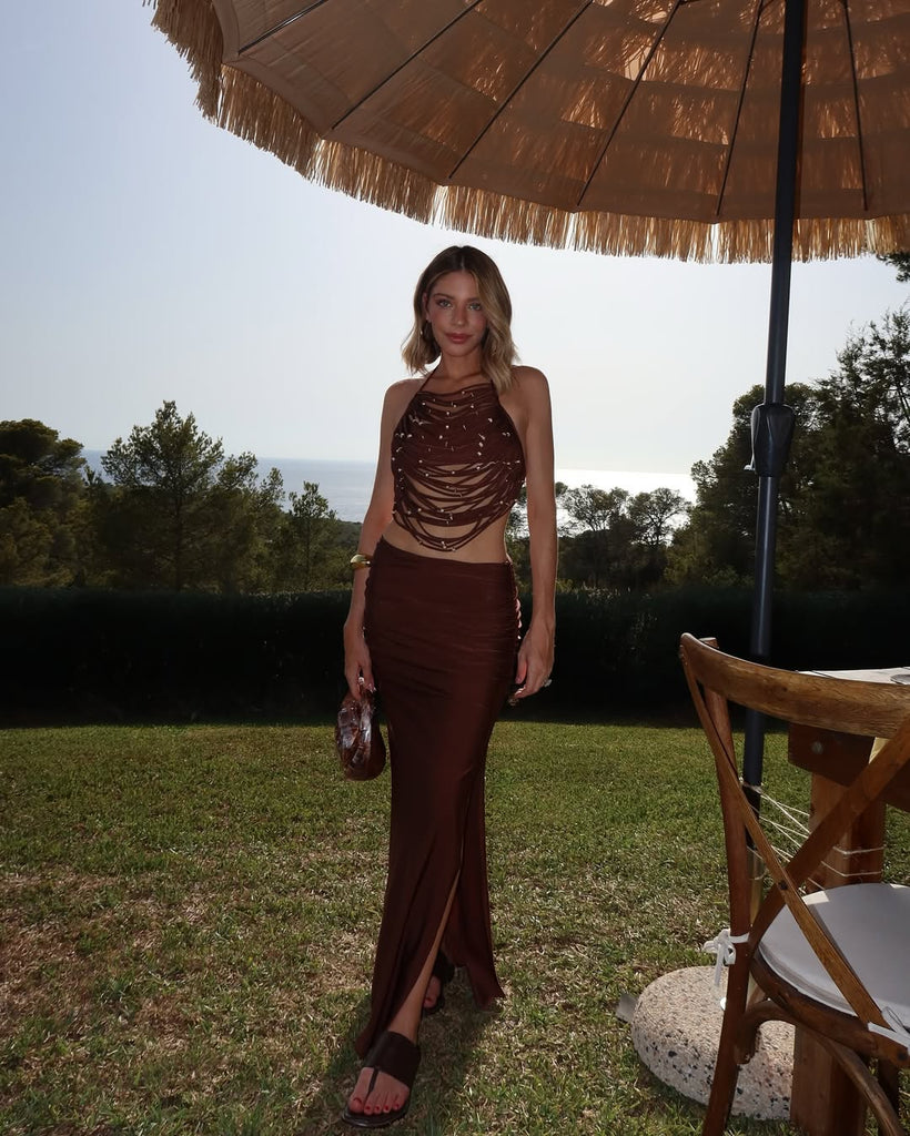 As tiras entrelaçadas com aplicações de esferas douradas criam um visual artesanal e contemporâneo, revelando a pele de forma sutil.