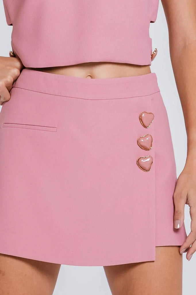 Com caimento estruturado e modelagem ampla, o Short Saia Circe aposta na modernidade do shape aliado à feminilidade dos botões coração. O transpasse frontal cria um visual atual, enquanto o zíper lateral mantém a praticidade. Uma peça fashionista que transita entre diferentes produções com facilidade.