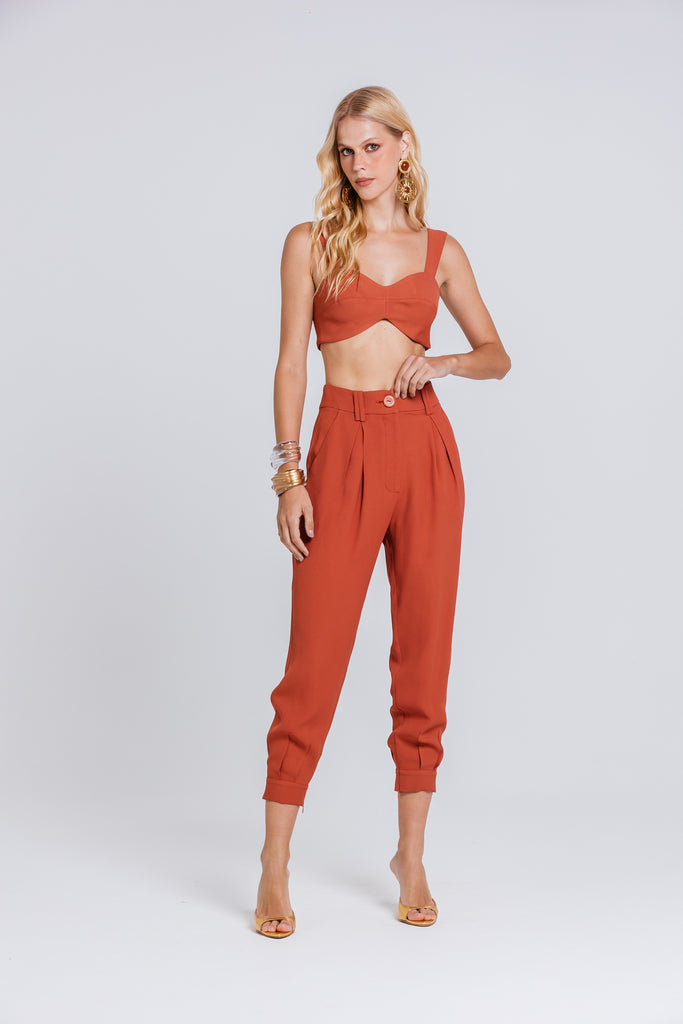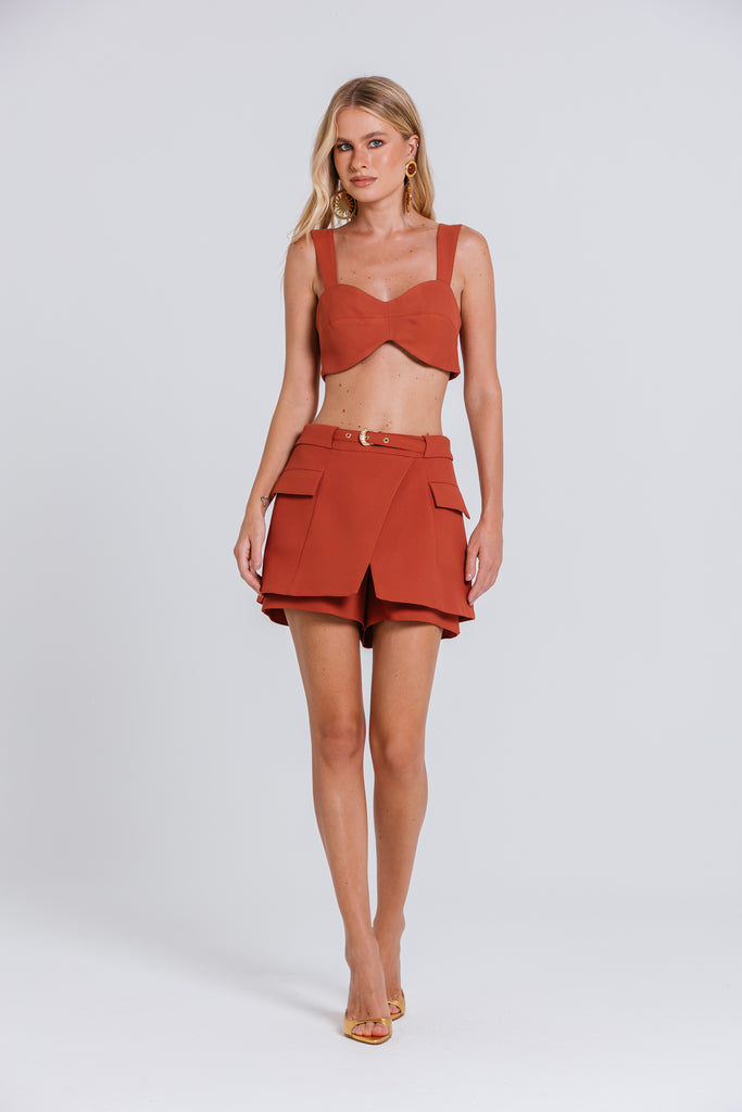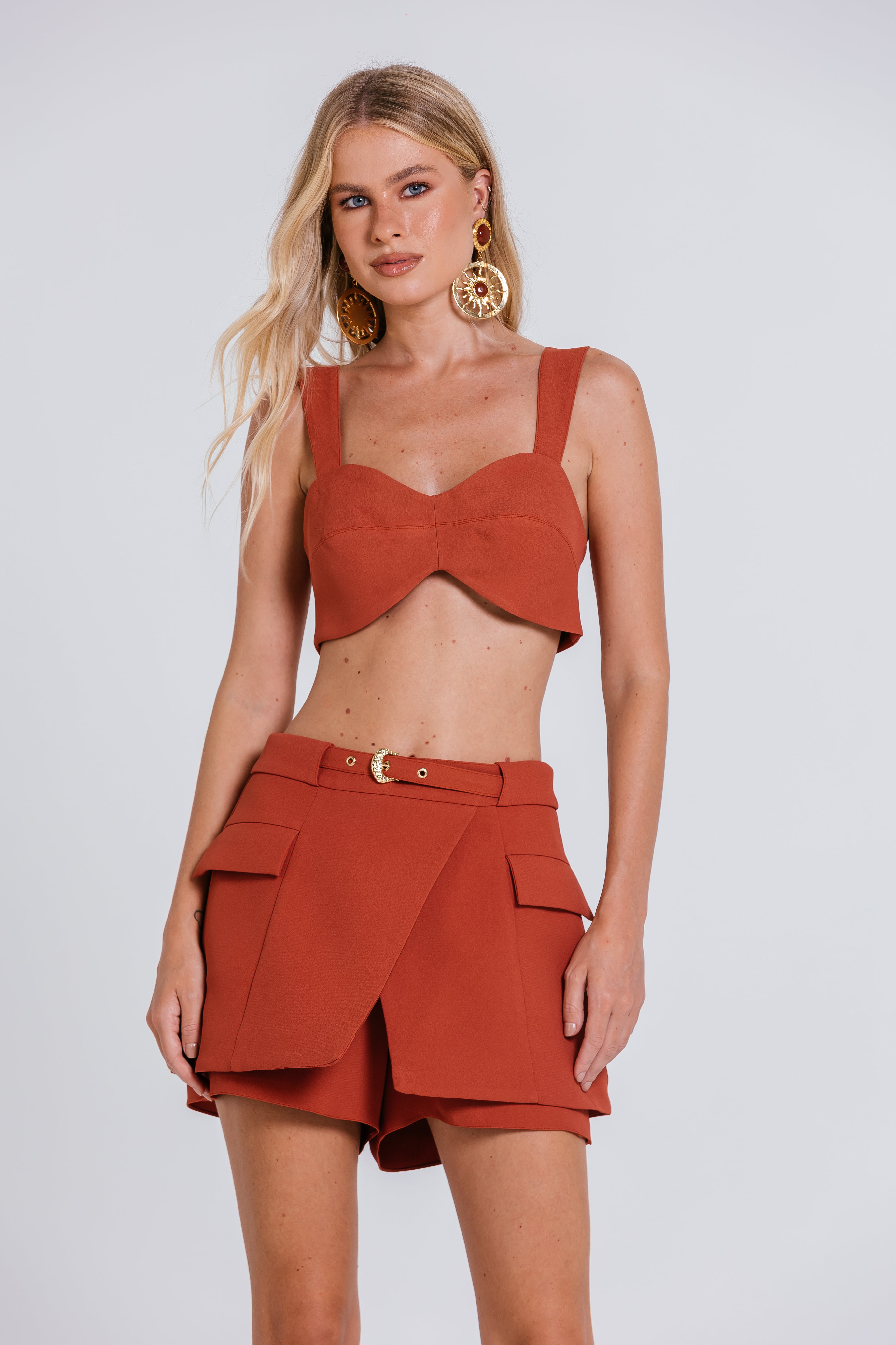 Combine o Top Lyra com a Calça Persefone para uma produção elegante e estruturada, ou com o Short Saia Florence para um visual casual e moderno.