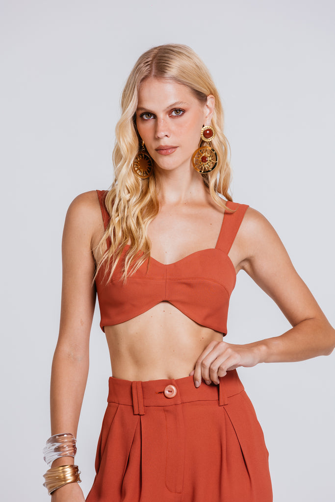 Confeccionado em crepe premium de acetato com viscose, oferece toque suave e caimento impecável. Sua modelagem cropped em estilo faixa valoriza a silhueta com um visual sofisticado, enquanto as alças estruturadas garantem conforto e segurança. O recorte triangular na barra proporciona um ar ousado e único à peça, trazendo personalidade para qualquer produção. O fechamento posterior em zíper metálico é seguido por lastex.