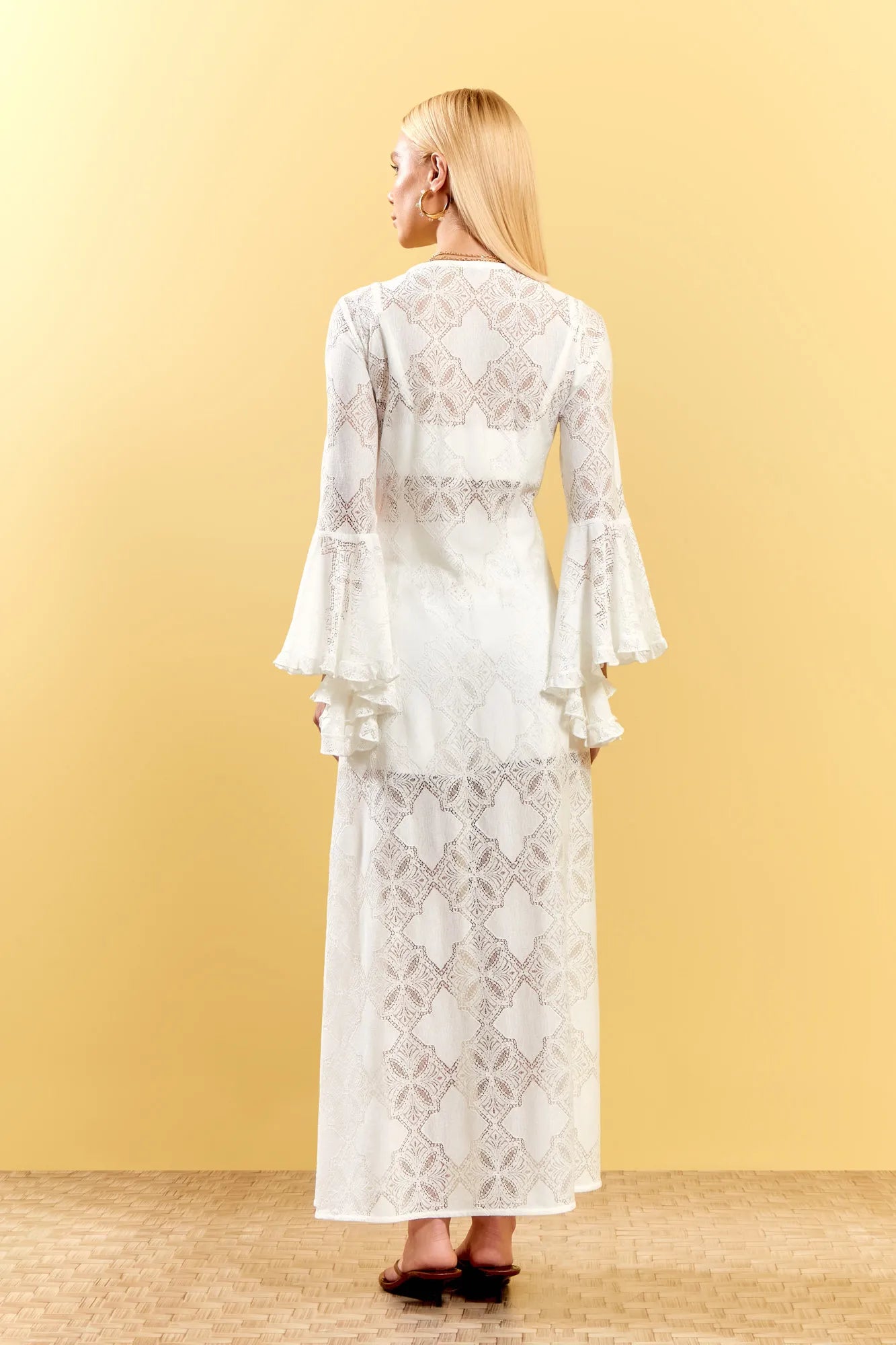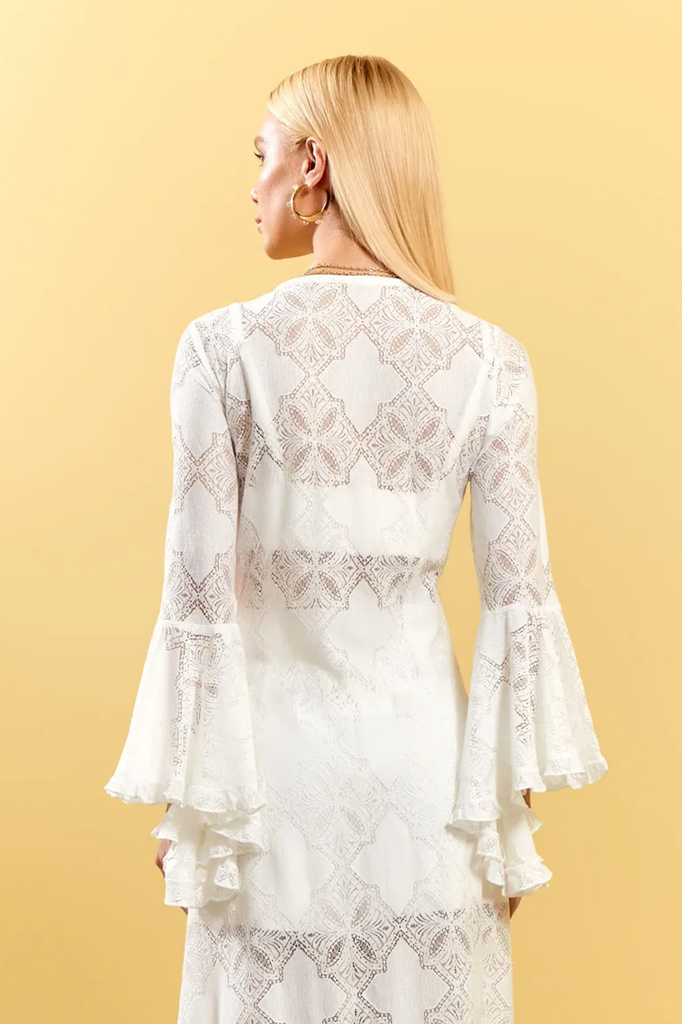 Blusa tipo tunica. Renda caimento leve e vazados losangos. Manga sino com babados que valorizam, botões forrados. É uma peça atemporal, chique, perfeita para o alto verão.
