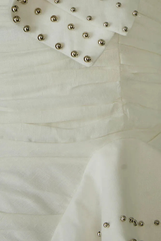 Vestido curto confeccionada em linho e modelagem ajustada e drapeada no corpo e saia em ¨A¨. Dois babados com duas fileiras de bolinhas em metal bodados a mão formando uma única alça e um arco na saia. Decote com detalhe em V com metal interno para ajuste. Zíper de metal central nas costas para fechamento da peça.