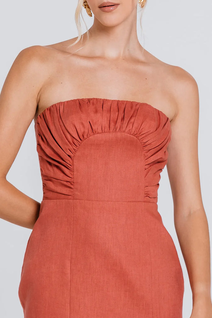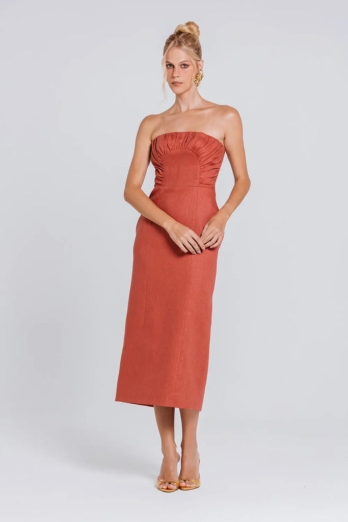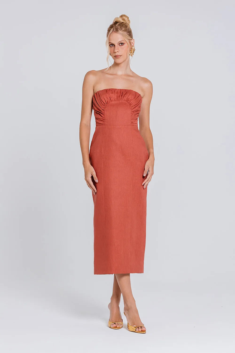 - Modelagem midi tomara que caia com recorte arredondado no meio frente, trazendo franzidos e texturas para a peça.