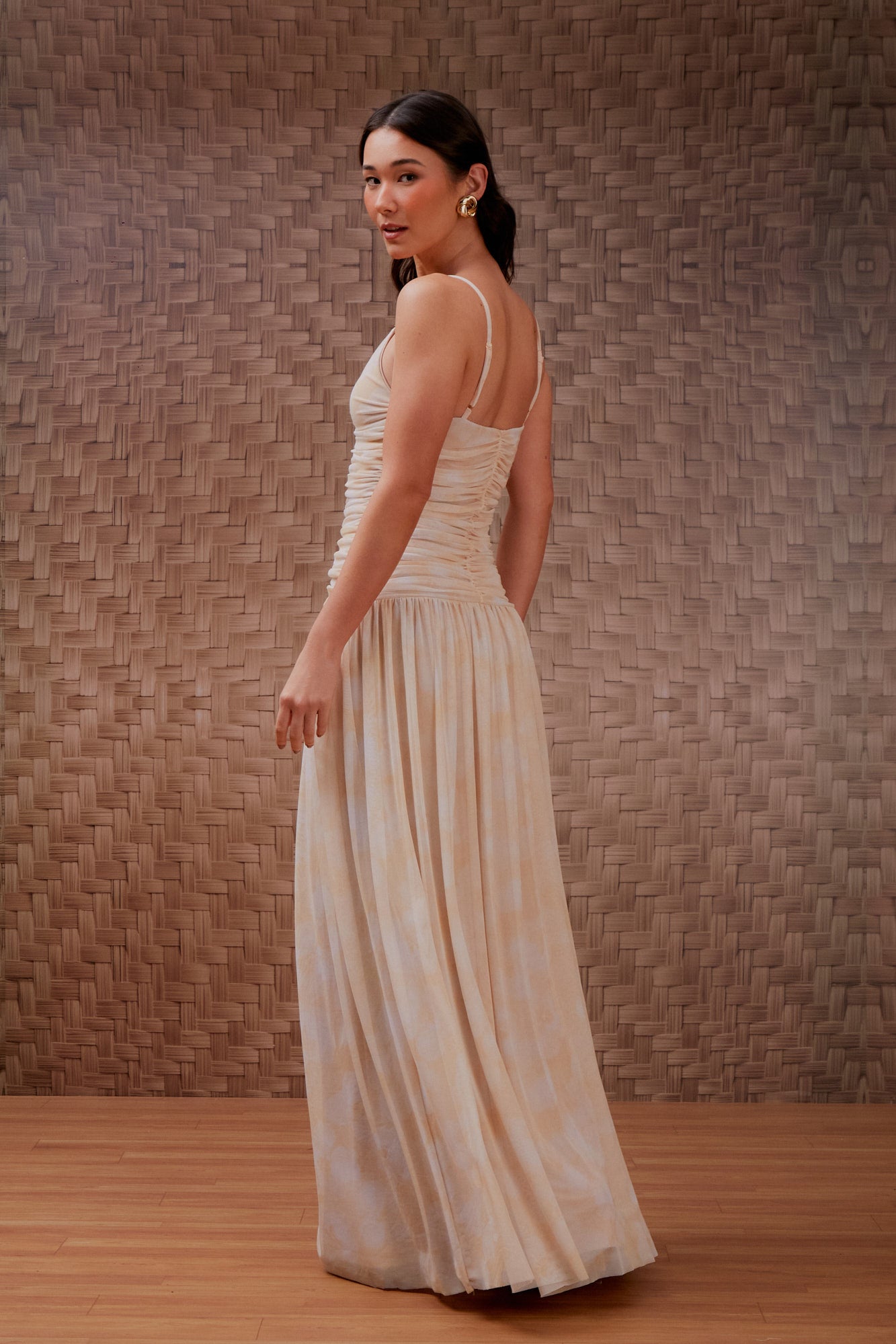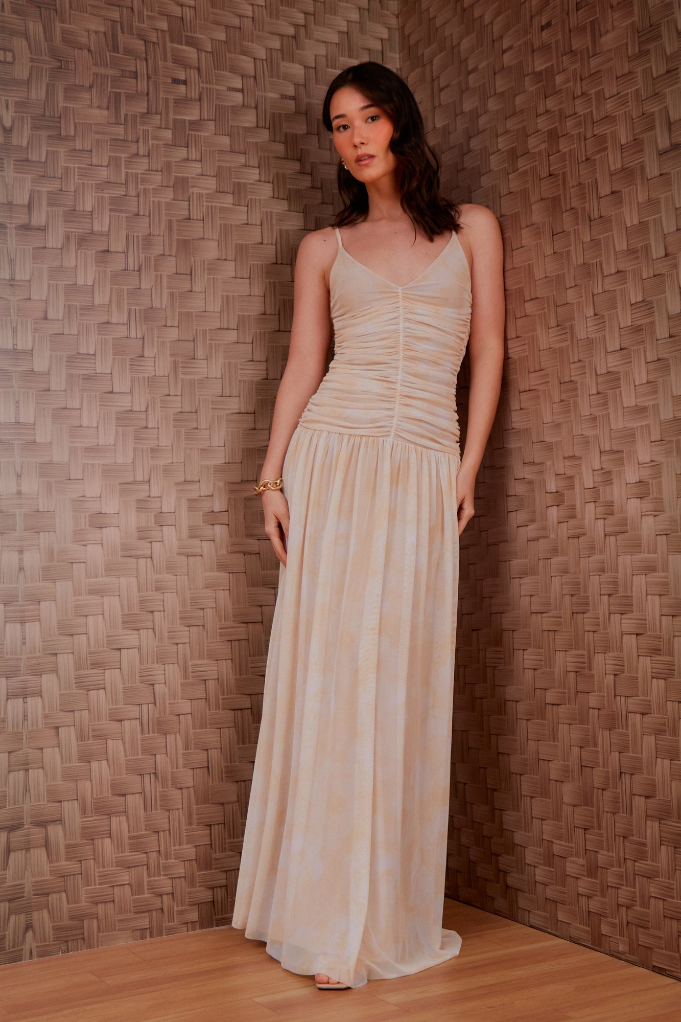 Vestido longo em tule de malha estampa exclusiva floral marmorizado. Todo drapeado e saia fluida godê. Os tules estão super em alta, são leves, e confortáveis.