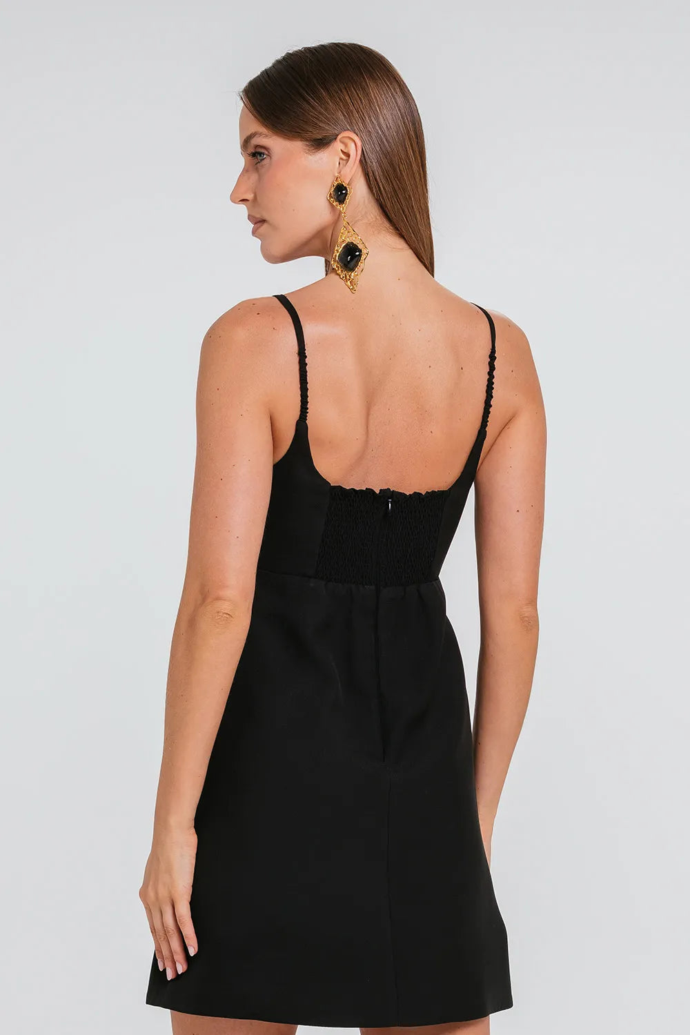 A peça apresenta modelagem sem mangas, com alças finas e decote frontal, que reforçam uma estética refinada e com muita informação de moda. Possui também o fechamento por zíper traseiro aliado ao lastex, desenhando as curvas femininas com muito charme e elegância.